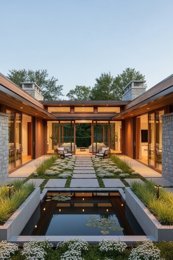 A courtyard-style plan places a small open-air space at the center of the house. Surrounding rooms receive better natural light and airflow.
