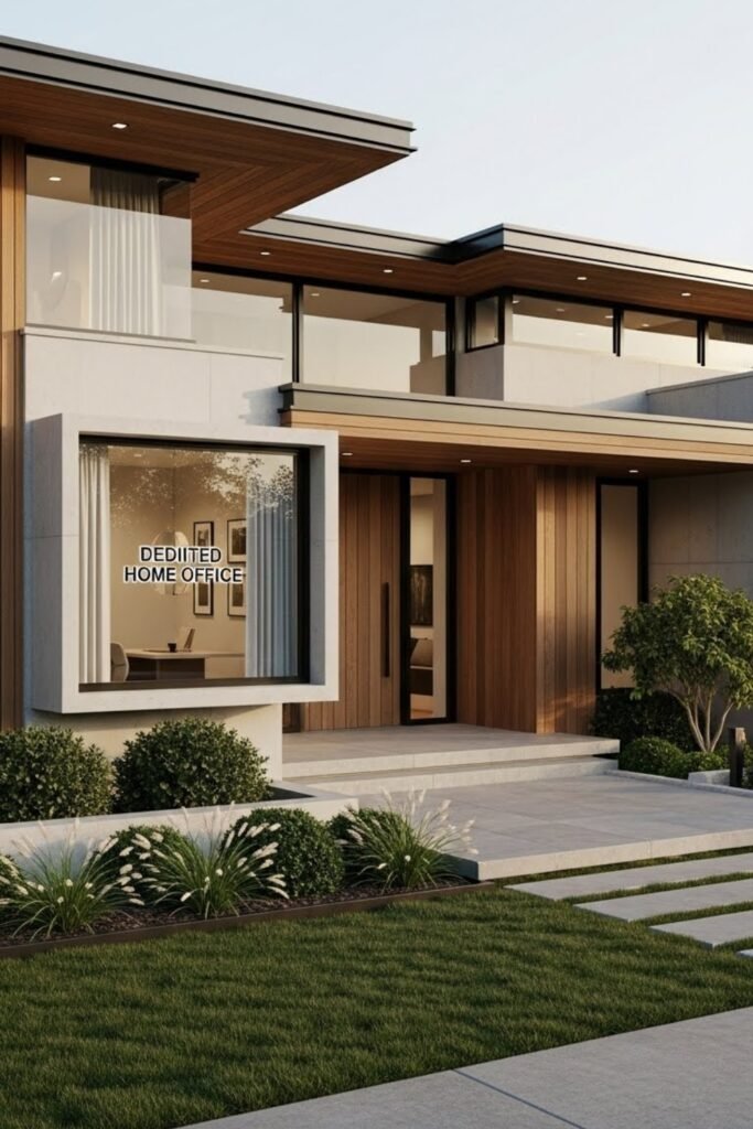 This layout includes a dedicated home office placed near the entrance or in a quiet corner of the house.