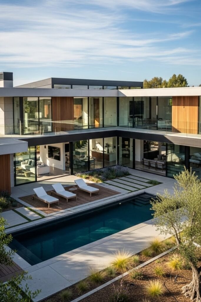 The layout improves outdoor views and privacy. It also helps block noise and creates a cozy, sheltered outdoor living area.