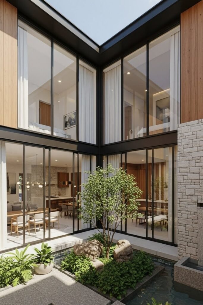 This layout is built around a central open courtyard that brings natural light and ventilation into every part of the house.