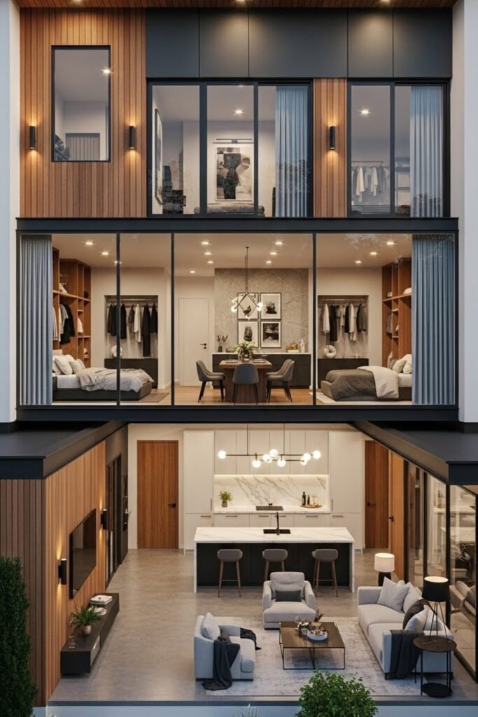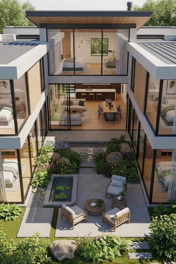 Bedrooms face inward instead of toward the street, improving privacy. It suits warm climates and homeowners who enjoy outdoor views while staying connected to the interior living spaces.