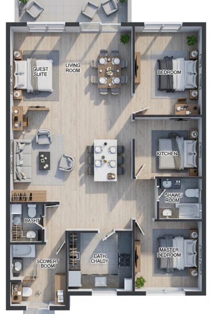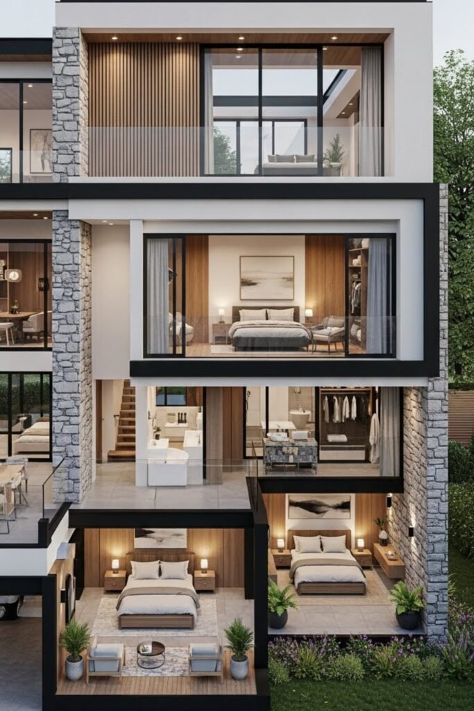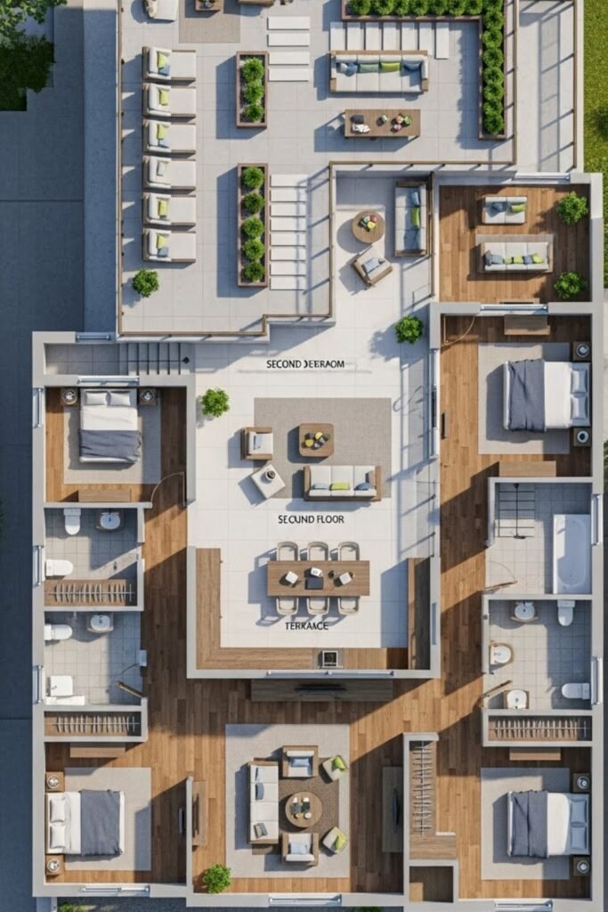 Bedrooms connect directly to patios, gardens, or terraces through sliding or French doors. This plan is ideal for homeowners who enjoy outdoor living and fresh air.