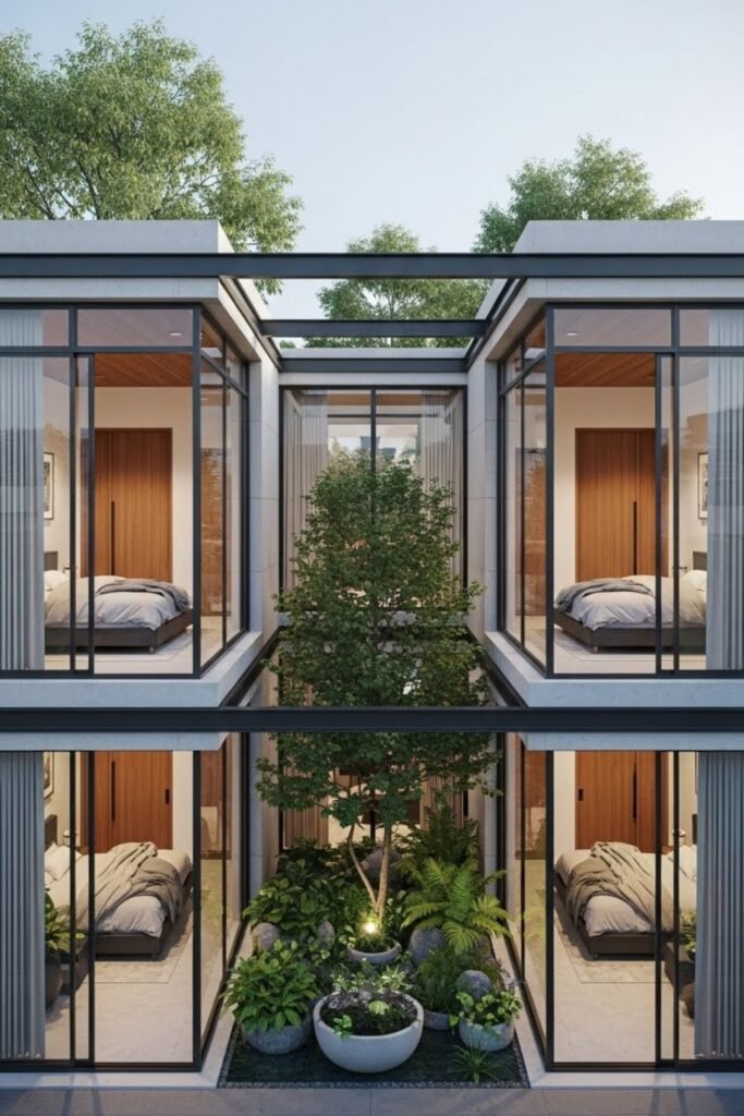 All bedrooms are oriented toward a courtyard or interior space rather than the street. This improves privacy, reduces noise, and enhances security.