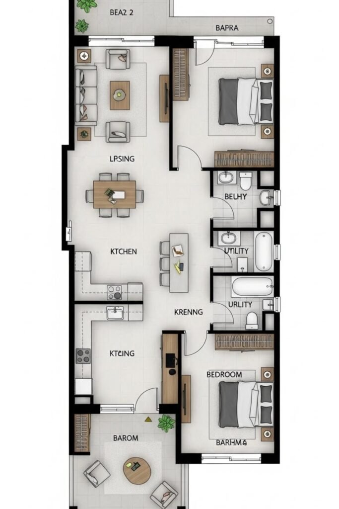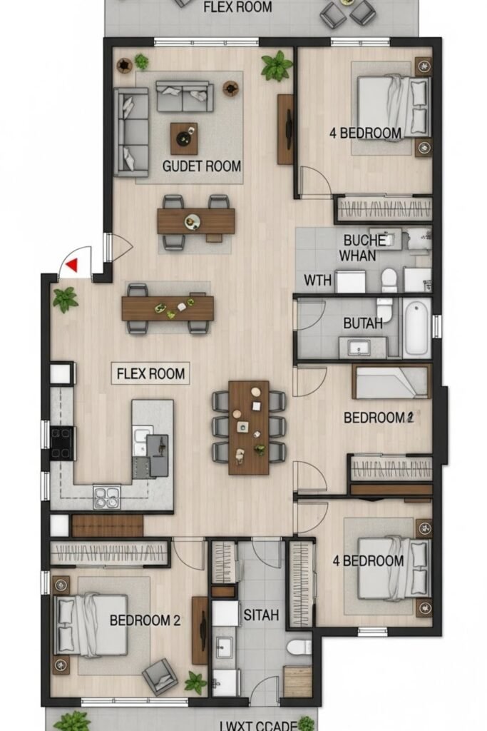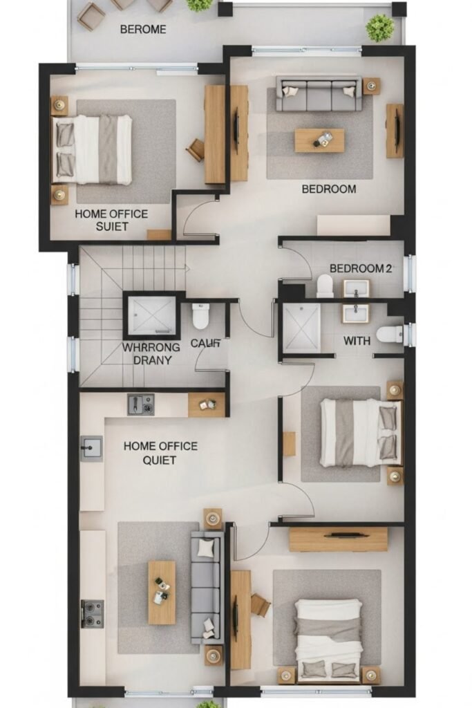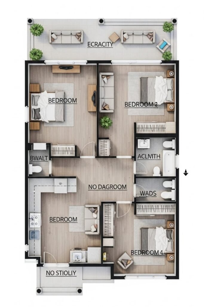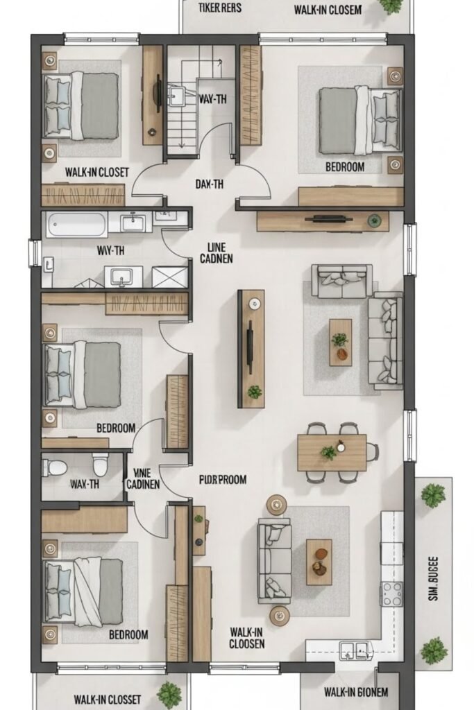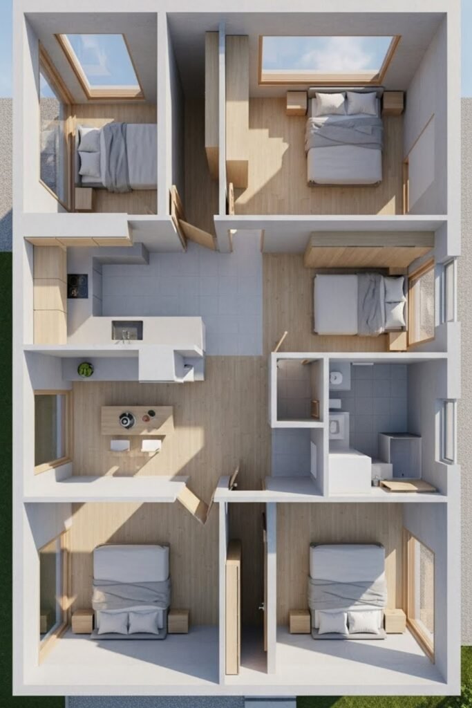 This 4 bedroom house plan is designed for long, narrow plots where width is limited. Bedrooms are arranged in a straight or staggered line to maximize usable space.