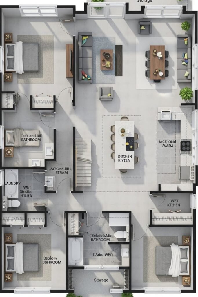 Two bedrooms share a Jack-and-Jill bathroom placed between them. This layout saves space and reduces plumbing costs while still giving both rooms direct bathroom access.