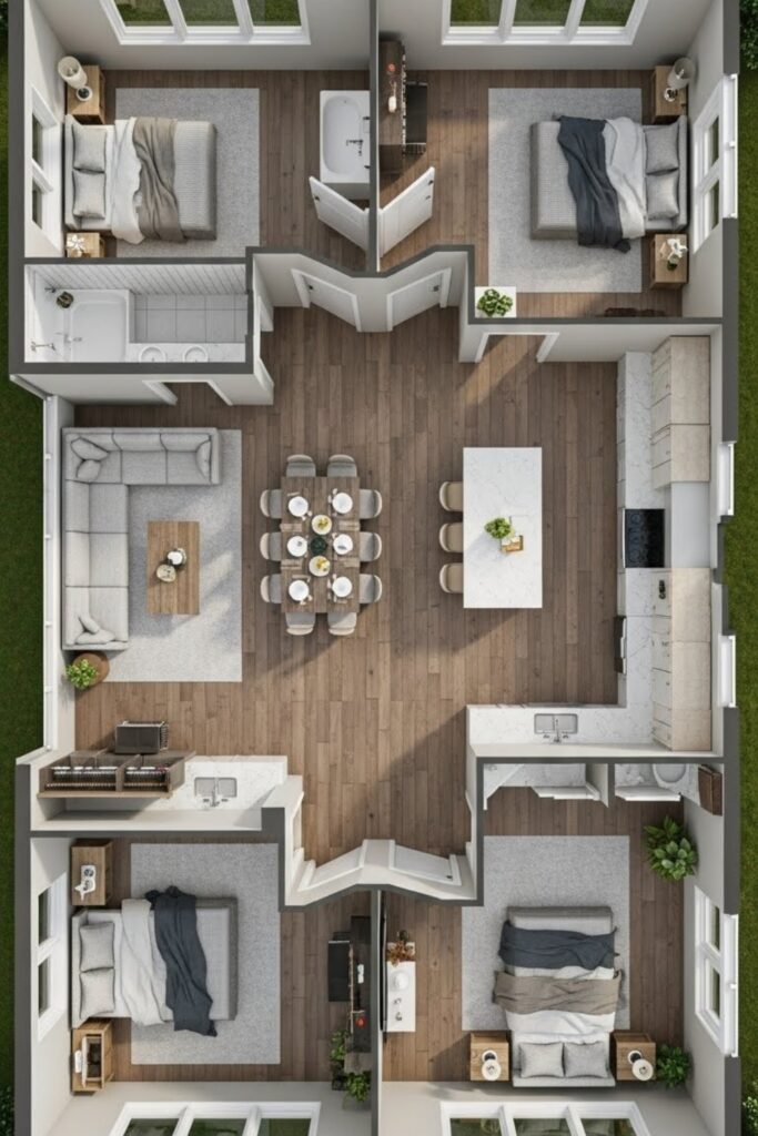 The main living, dining, and kitchen areas sit at the center of the home, with all four bedrooms placed around them.