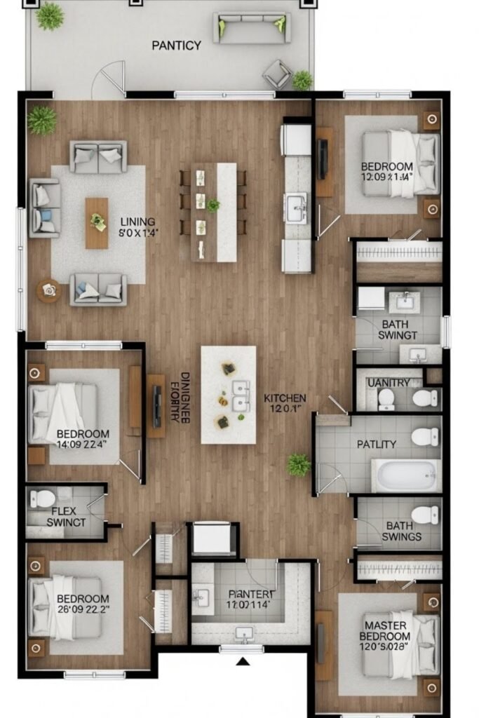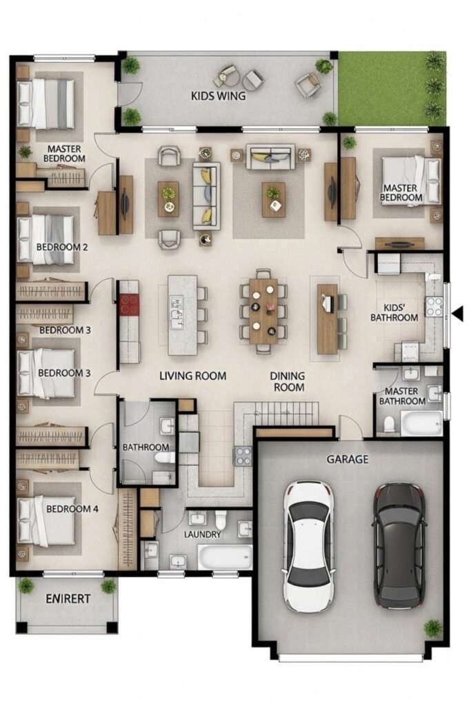 This 4 bedroom house plan places the master suite on one side of the home and the remaining bedrooms on the opposite side. It improves privacy, reduces noise, and works well for families with kids or guests.