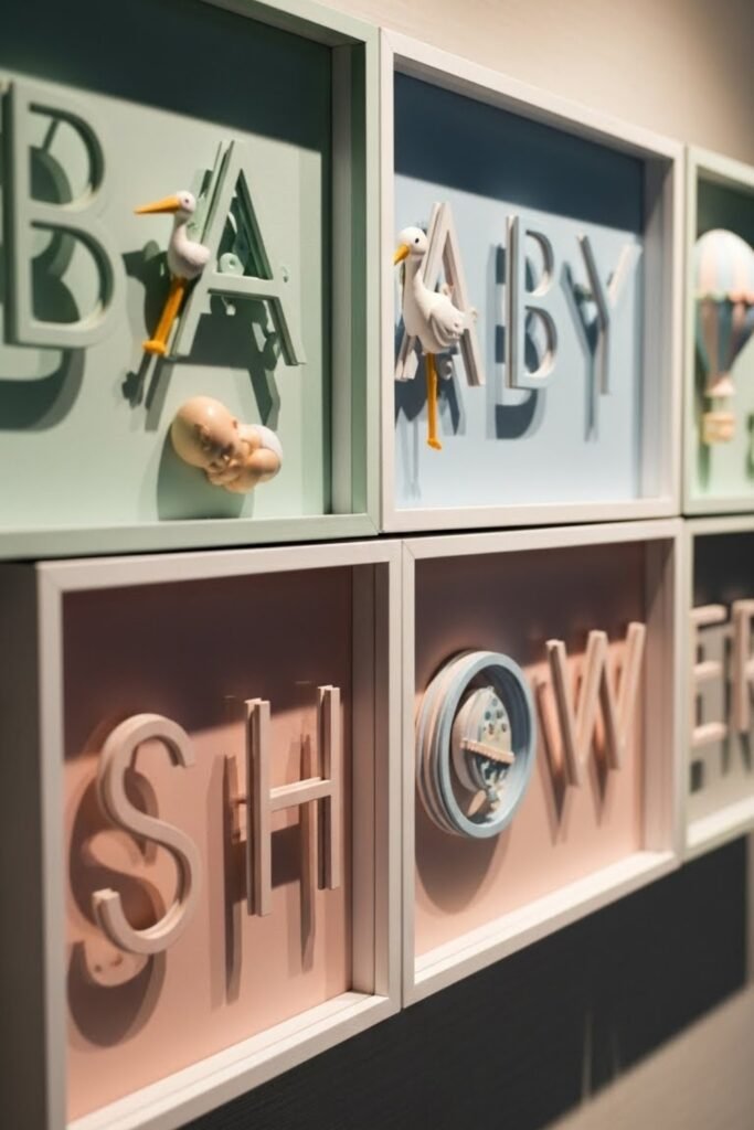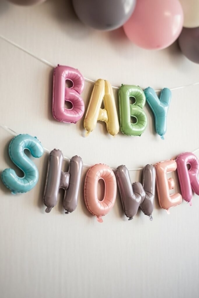 This idea works especially well for modern or minimalist baby showers. It feels polished, reusable, and blends easily with balloons, florals, or neutral backdrops.