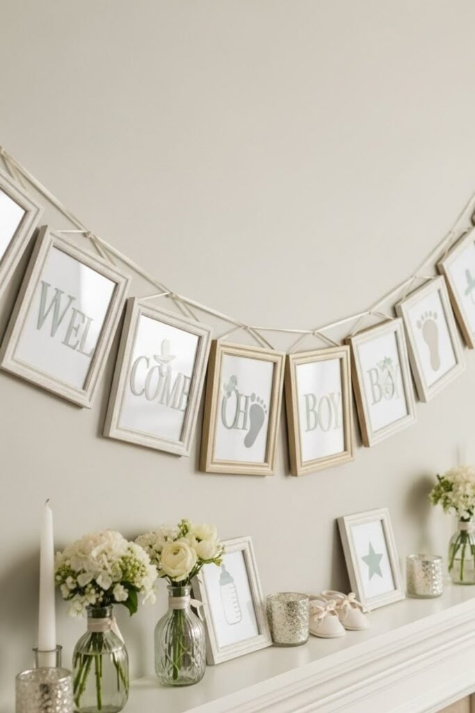 Create a banner made of small panels that tell a simple story—parents’ journey, baby milestones, or sweet phrases leading to “Welcome Baby.” Each panel adds curiosity as guests read along.