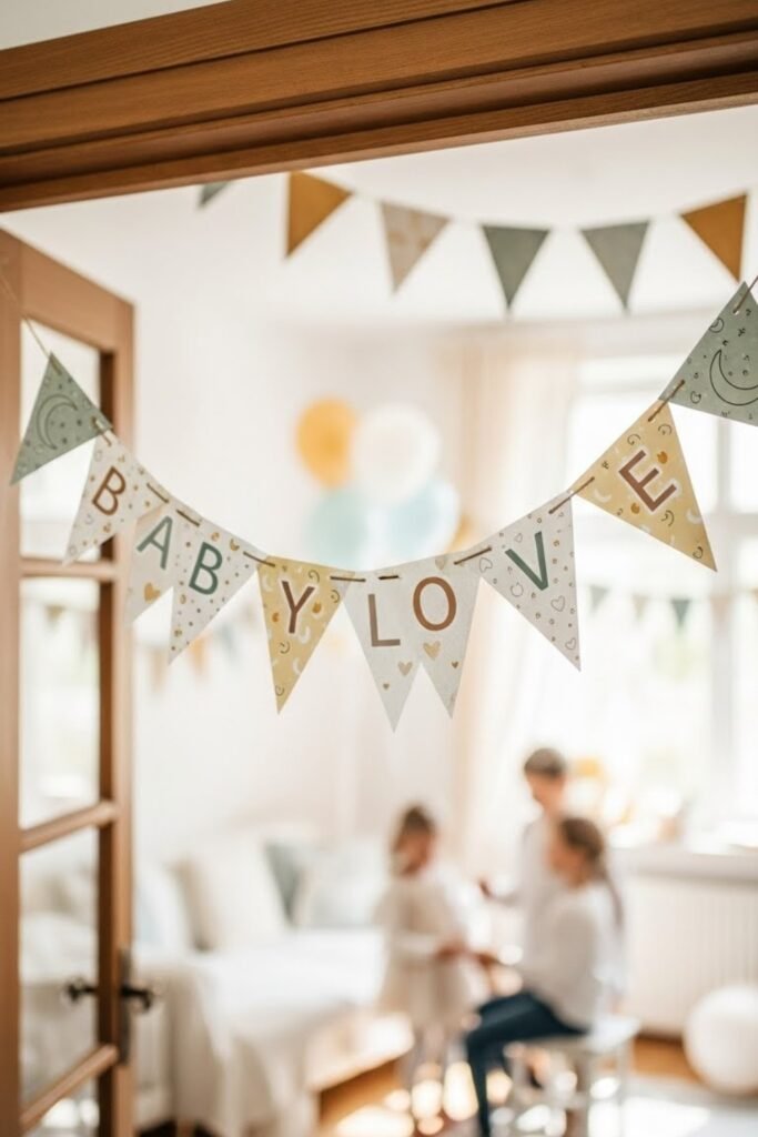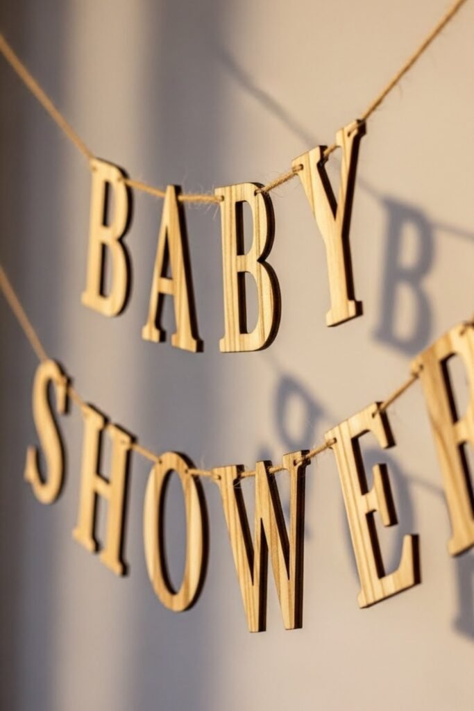 Design the banner using thin wooden letters or shapes strung together with twine. The natural texture adds warmth and works beautifully for rustic or neutral baby showers.