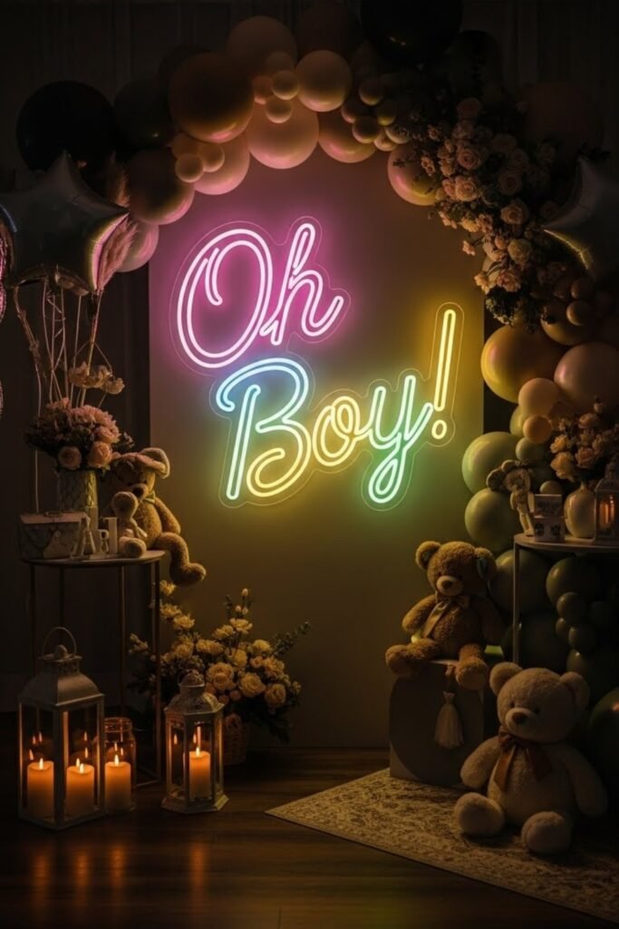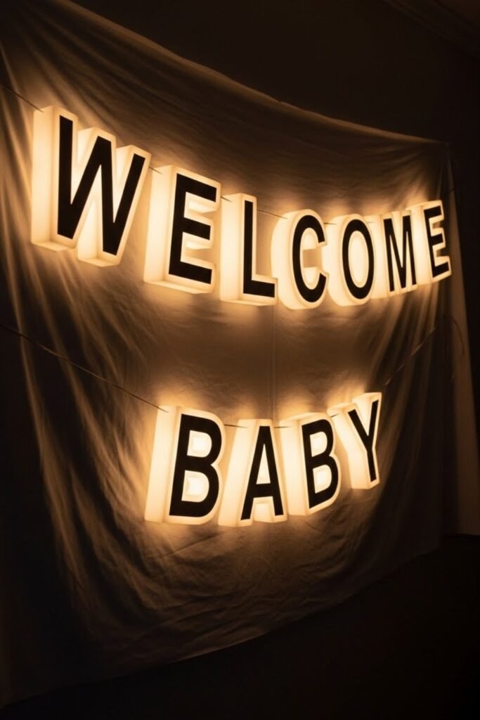 Create a banner using softly lit letters with warm bulbs or LED glow. Keep the lighting gentle to suit the baby shower mood.