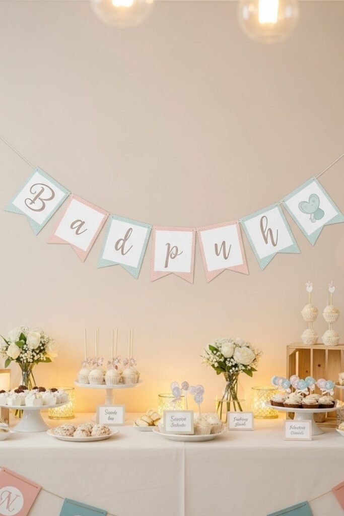 A baby shower banner does more than fill wall space – it helps define the theme, guide the color palette, and create a clear focal point for photos.
