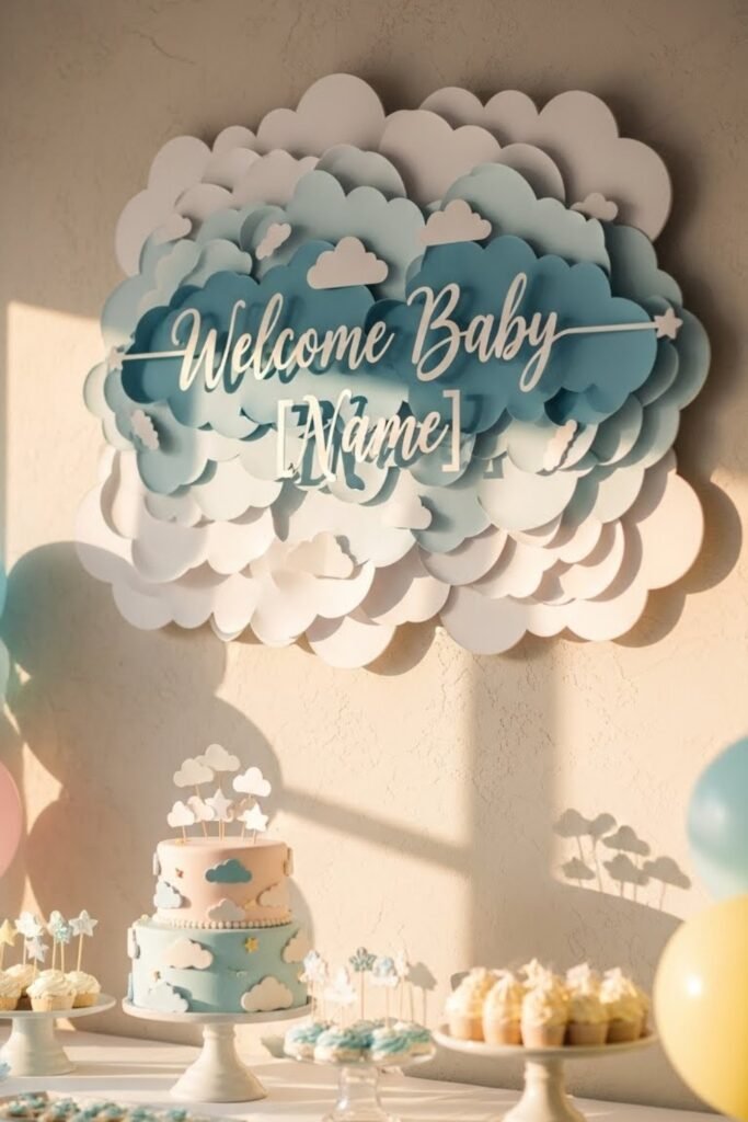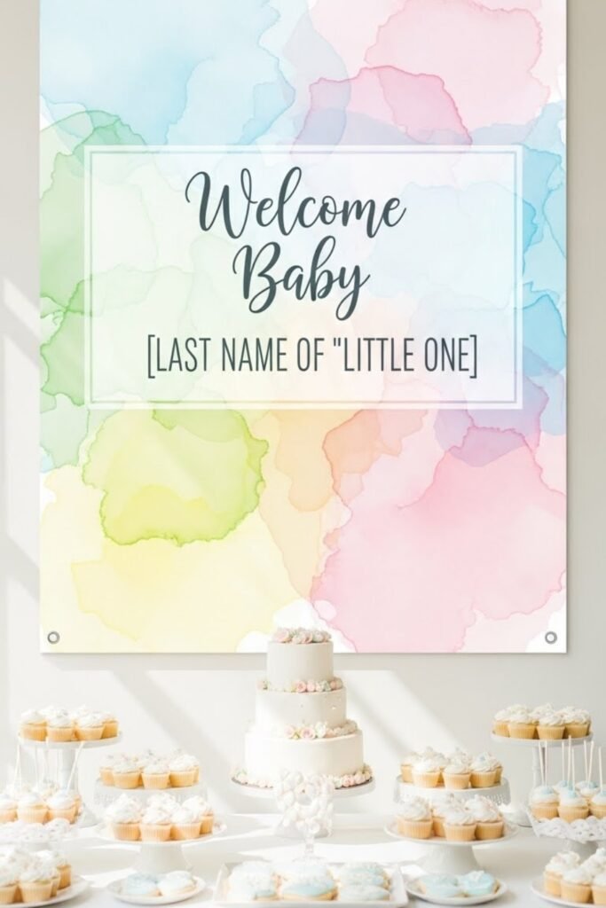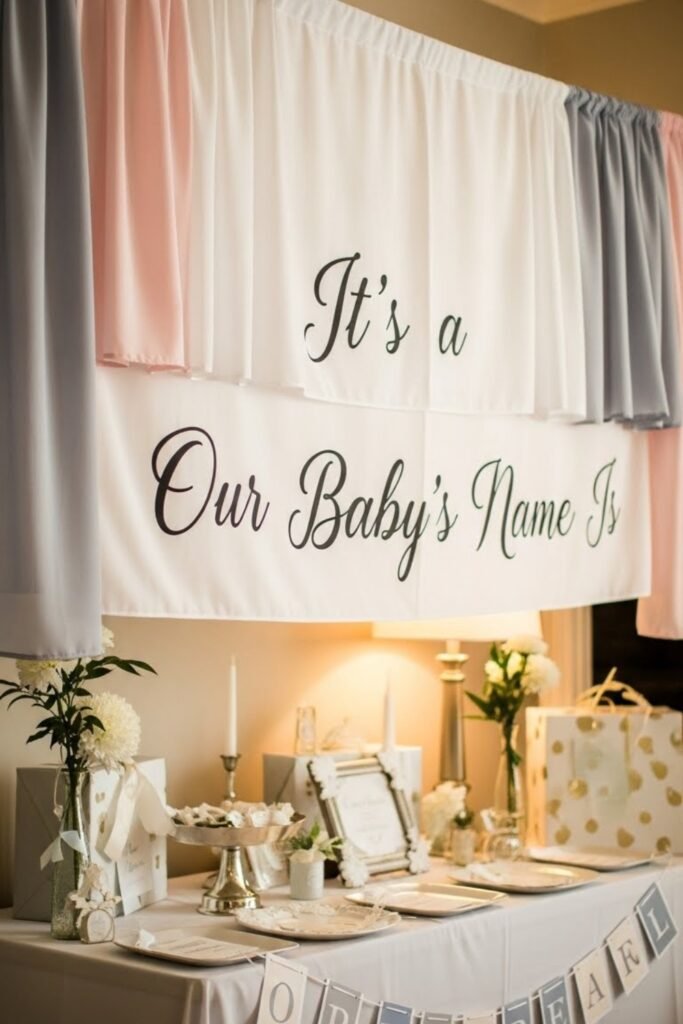 Turn the banner into a special moment by revealing the baby’s name for the first time. Use layered letters, soft colors, or covered sections guests uncover together.