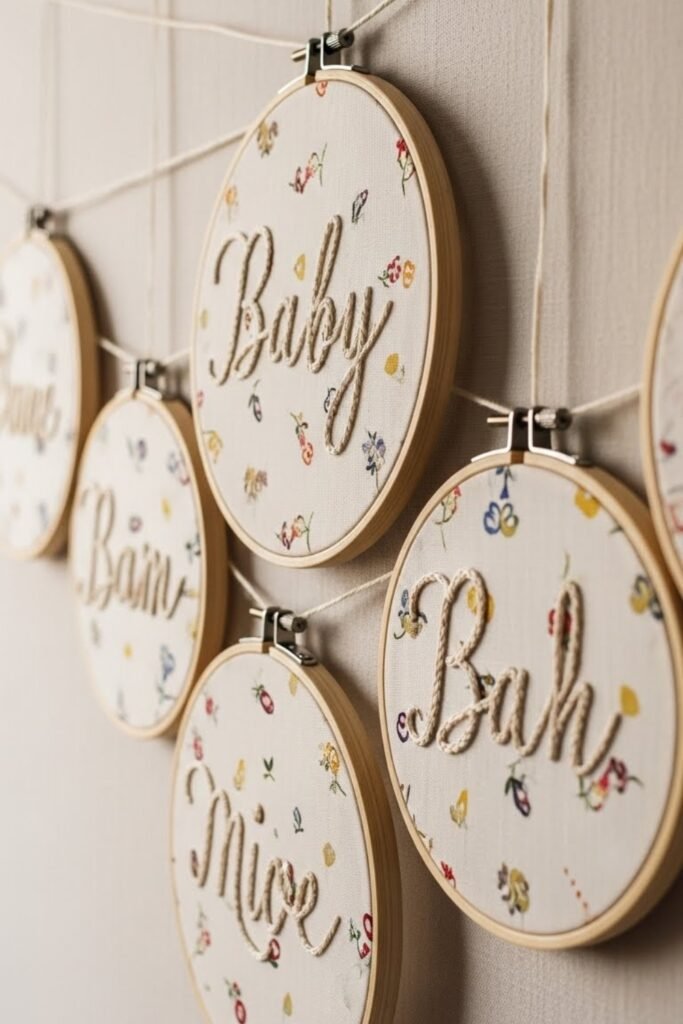 Use embroidery hoops as individual banner sections, each featuring a letter or small design. Hang them in a straight line or staggered layout for visual interest.