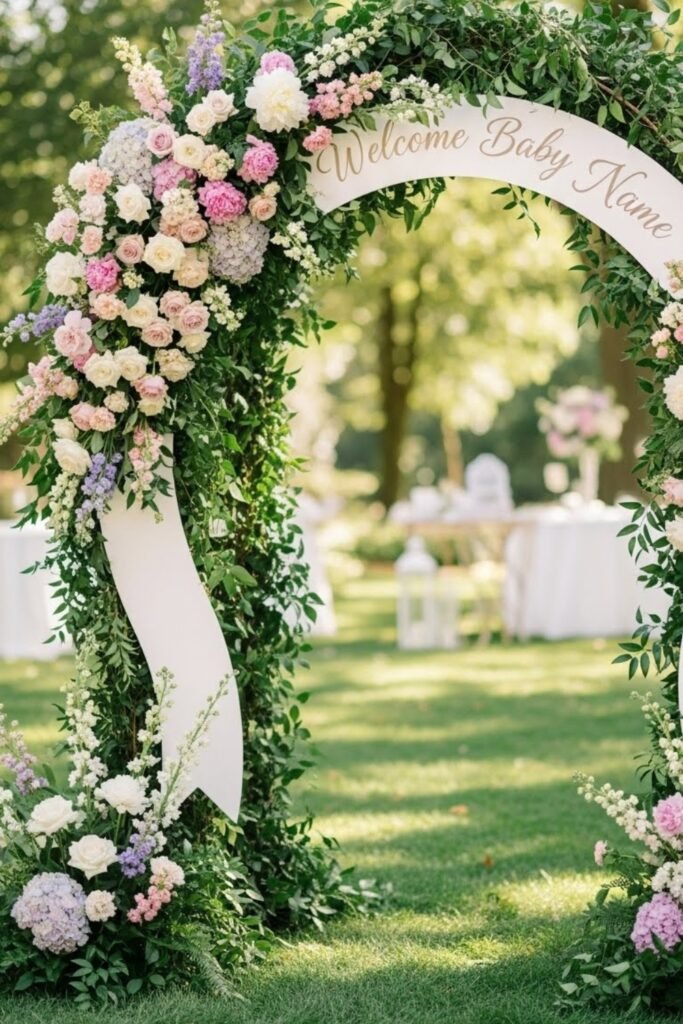 This setup instantly draws attention and frames the celebration space. It’s ideal for outdoor showers or nature-inspired themes where the banner becomes part of the scenery.