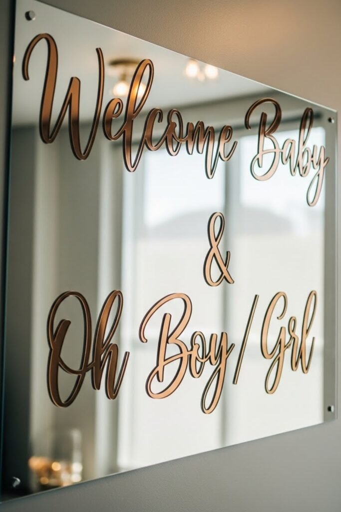 Design the banner with reflective or mirrored backing and soft script lettering. The subtle shine catches light and instantly elevates the decor.