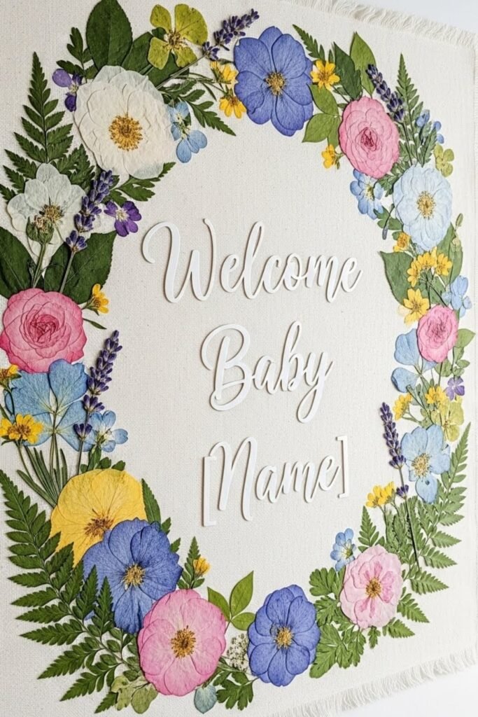 Create a banner using real or faux pressed flowers arranged around letters or panels. The flat floral look feels delicate and artistic without being bulky.