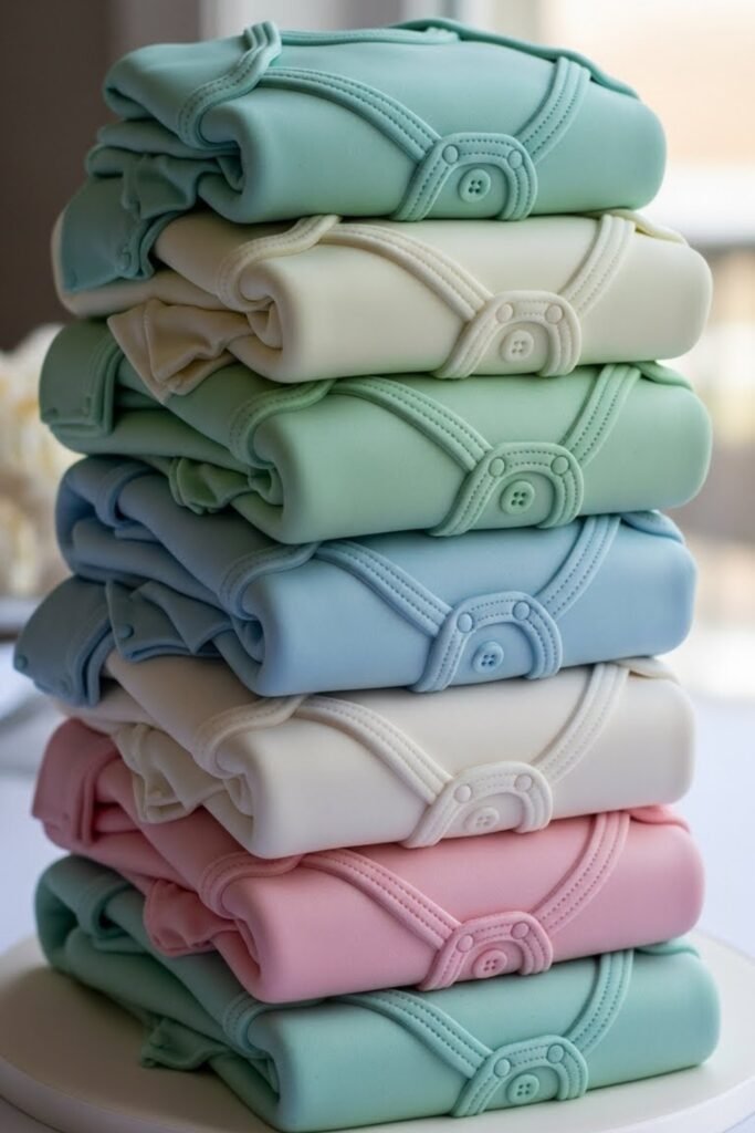 This cake is designed to look like folded baby onesies stacked neatly on top of each other. Soft fabric textures, tiny button details, and pastel shades make it feel realistic and cozy.