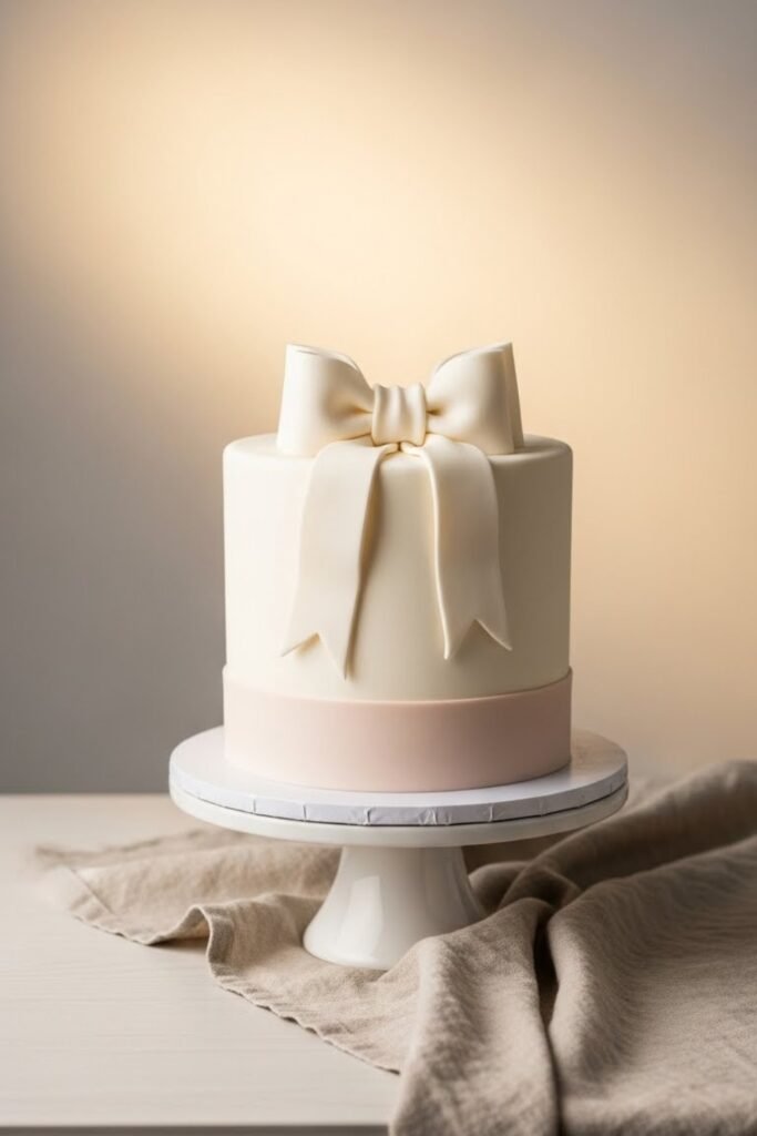 A clean, modern cake finished with one oversized fondant bow as the focal point. The simple design keeps it elegant while still feeling baby-appropriate.