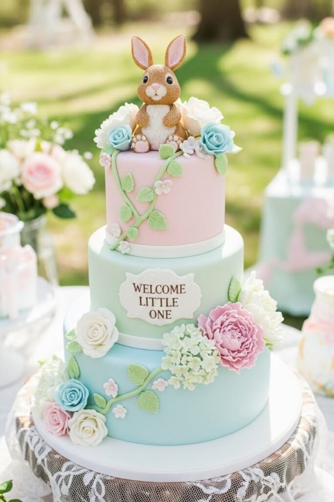This cake brings a gentle garden feel with a small bunny figure, soft florals, and light greenery. Muted colors keep it soothing rather than playful.
