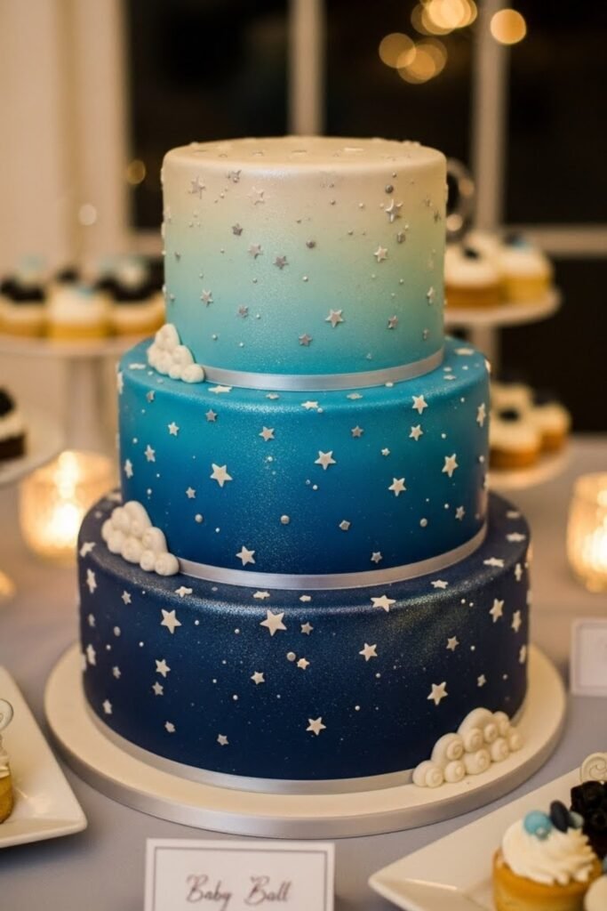 This cake uses soft night-sky colors with tiny stars scattered across the tiers. Gentle gradients and subtle shimmer create a calm, dreamy look without feeling too bold.