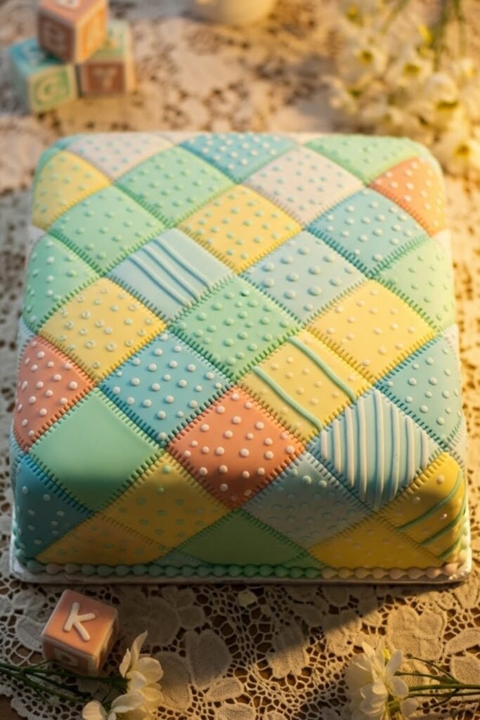 Designed to resemble a patchwork baby quilt, this cake features stitched-style fondant panels in soft coordinating colors.