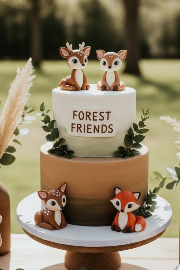 This cake includes small woodland animals like deer, foxes, or owls placed subtly around the tiers. Earthy tones and light greenery keep the design calm and modern.