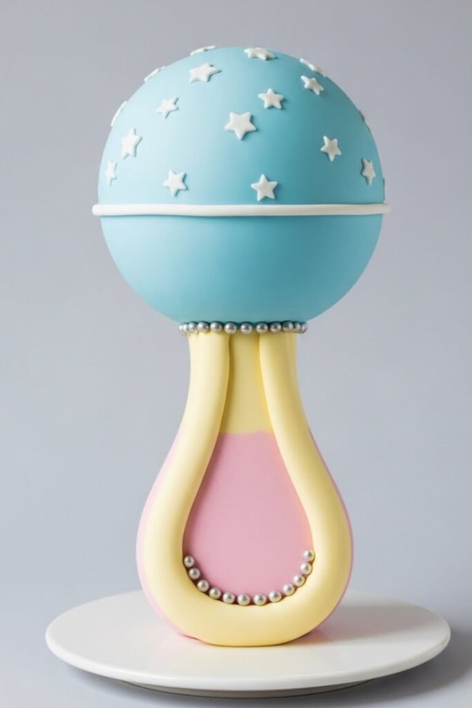 A playful yet clean design inspired by a baby rattle shape or topper. Smooth fondant, rounded edges, and soft colors keep it cute without being overdone.