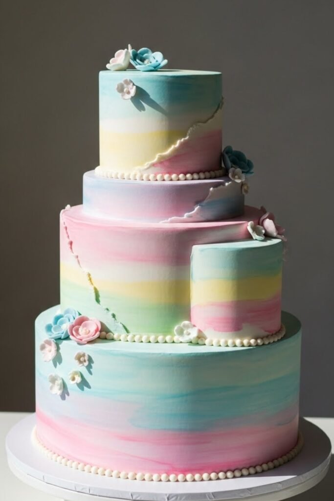 This cake features soft, blended color strokes that look hand-painted. Gentle hues fade into each other, creating an artistic and calm look.
