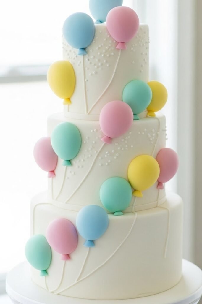 This cake is styled with fondant balloons floating around the tiers. Rounded shapes and soft colors give it a cheerful feel without looking busy.