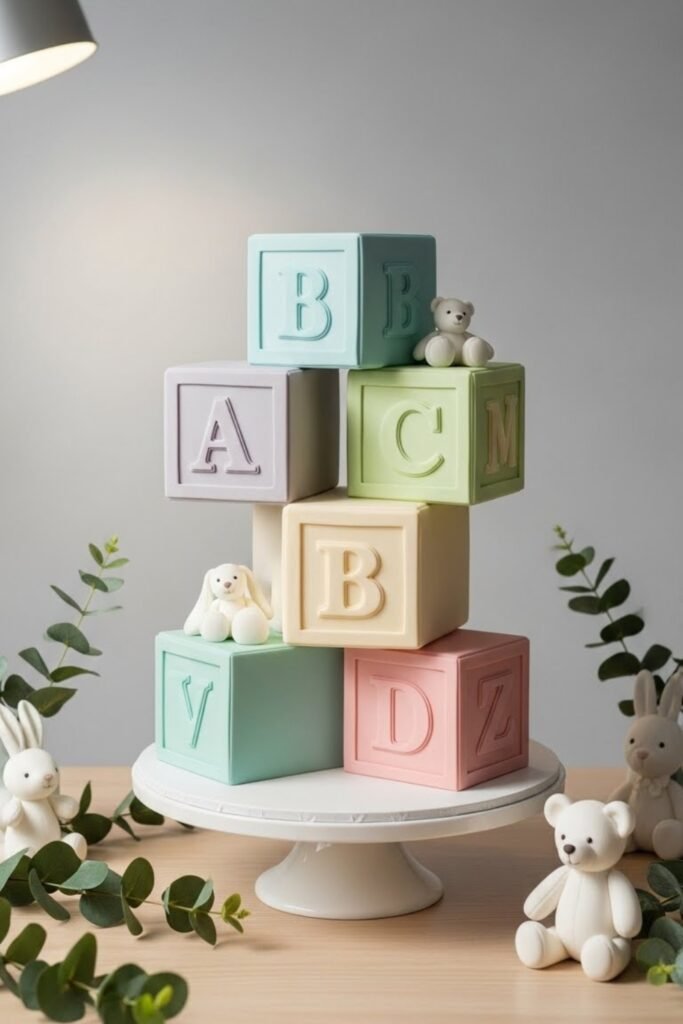 Inspired by classic toy blocks, this cake features square tiers styled like alphabet or number cubes. Each side can show a letter, symbol, or soft illustration.