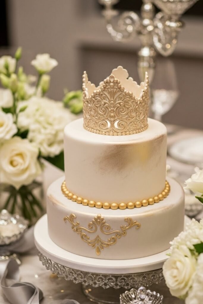 This cake features a delicate crown design placed on top or wrapped around the upper tier. Soft metallic touches paired with neutral tones keep it elegant rather than flashy.