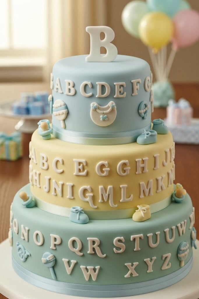 Designed with raised letters scattered across the tiers, this cake celebrates early learning in a soft, decorative way. Muted colors and clean spacing keep it from looking busy.
