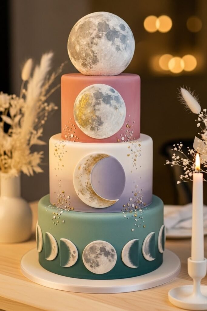This cake showcases the phases of the moon arranged gently around the tiers. Soft gradients and subtle textures create a calm, modern look.