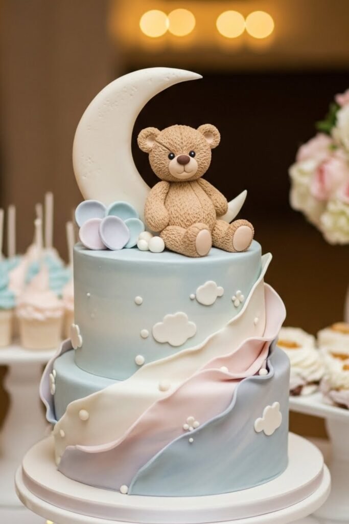 A small teddy bear resting against a crescent moon gives this cake a dreamy, bedtime feel. Gentle colors like cream, dusty blue, or soft beige help keep it calm and elegant.