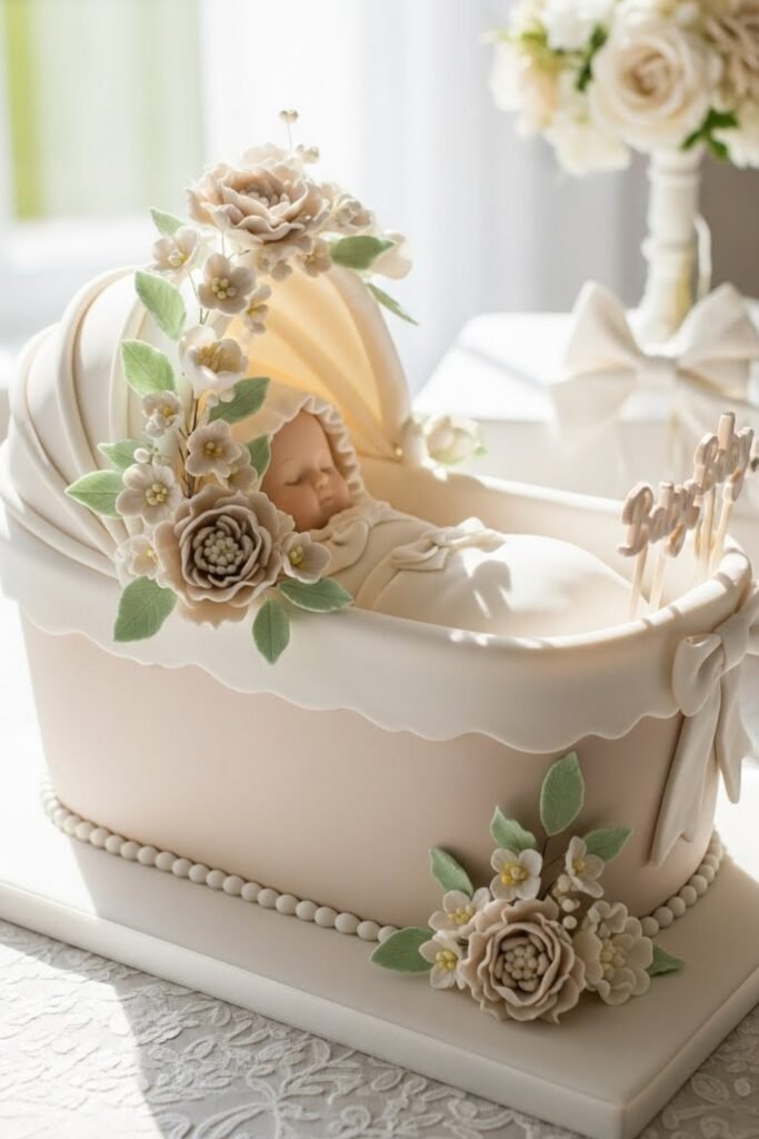 This cake is shaped like a baby bassinet and decorated with subtle floral accents. Smooth fondant, soft neutral tones, and light greenery create a refined look without feeling too formal.