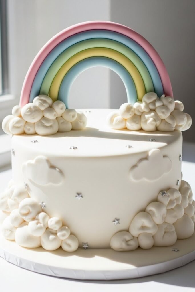 Designed with fluffy cloud details and a soft pastel rainbow, this cake feels light and cheerful. The colors stay muted rather than bright, making it suitable for elegant or gender-neutral showers.