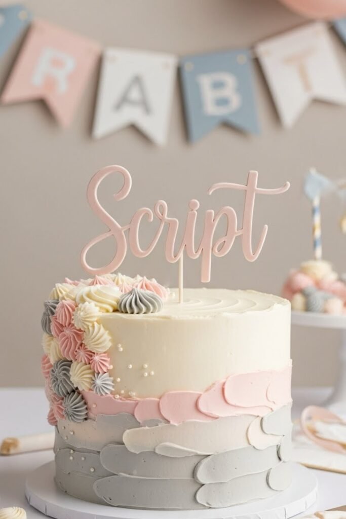 This cake focuses on the baby’s name written in flowing script across the top or side. Minimal decorations keep the name as the highlight.