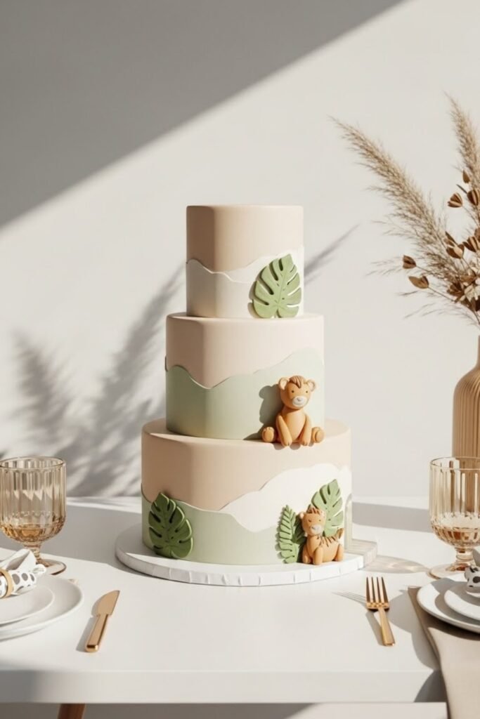 This cake features subtle safari elements like tiny animals or leaf details in warm neutral shades. Beige, soft brown, and muted green create a calm, modern look.