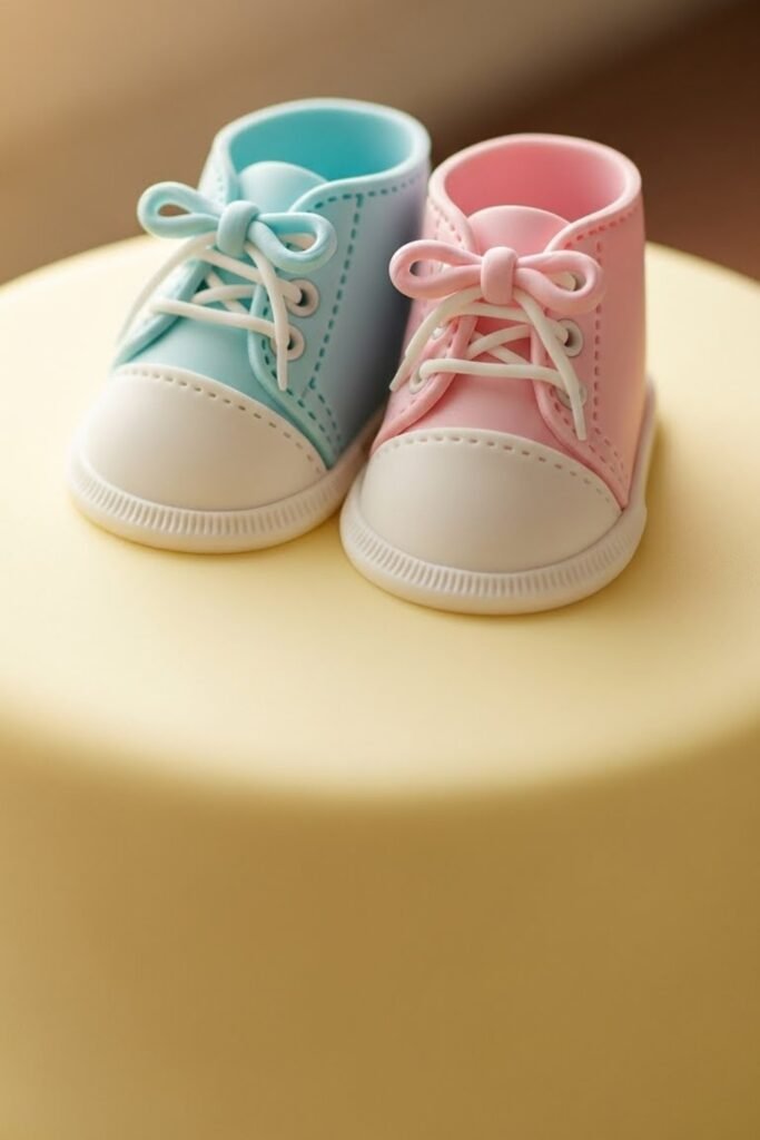 This cake features tiny baby shoes placed on top or designed into the tiers. Soft fondant textures and gentle colors make the shoes look realistic without feeling heavy.