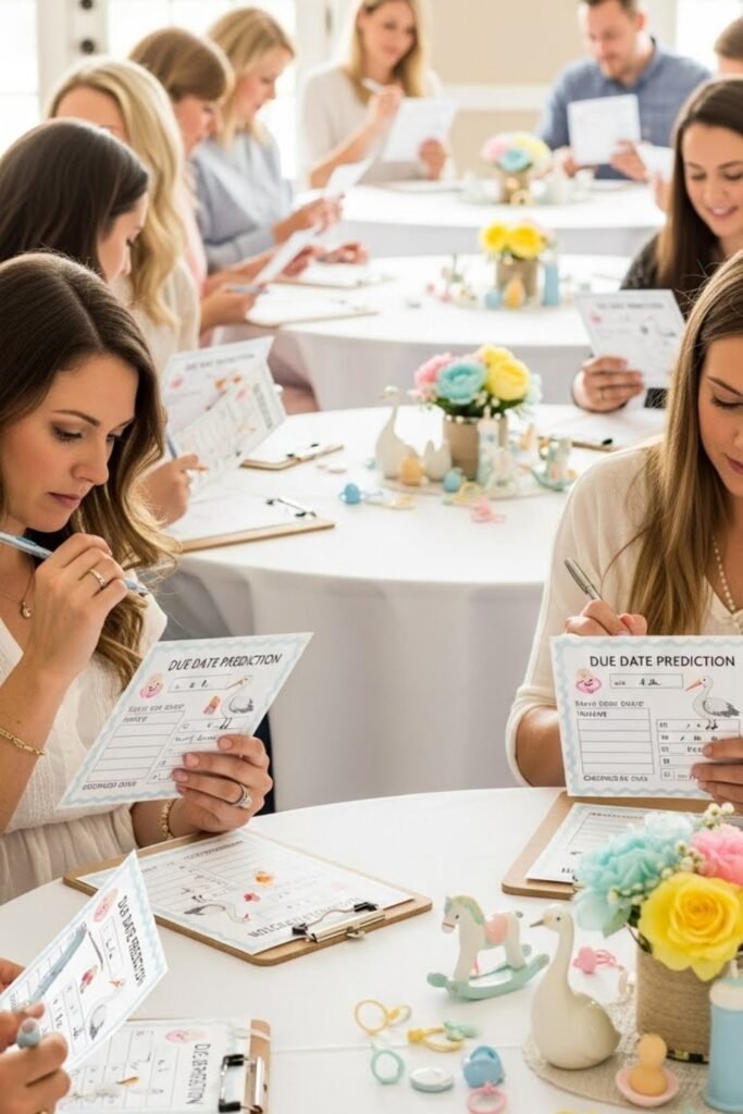 Ask guests to predict the baby’s arrival date, time, weight, and length on a card. Collect the cards and save them for after the baby is born. The guest with the closest guesses wins later. This game doubles as a keepsake for the parents-to-be.