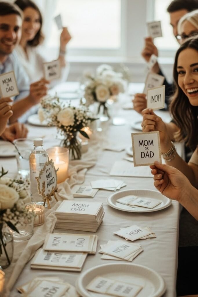 Prepare cards with funny or sweet parenting facts. Guests guess whether each statement applies to the mom or dad.
