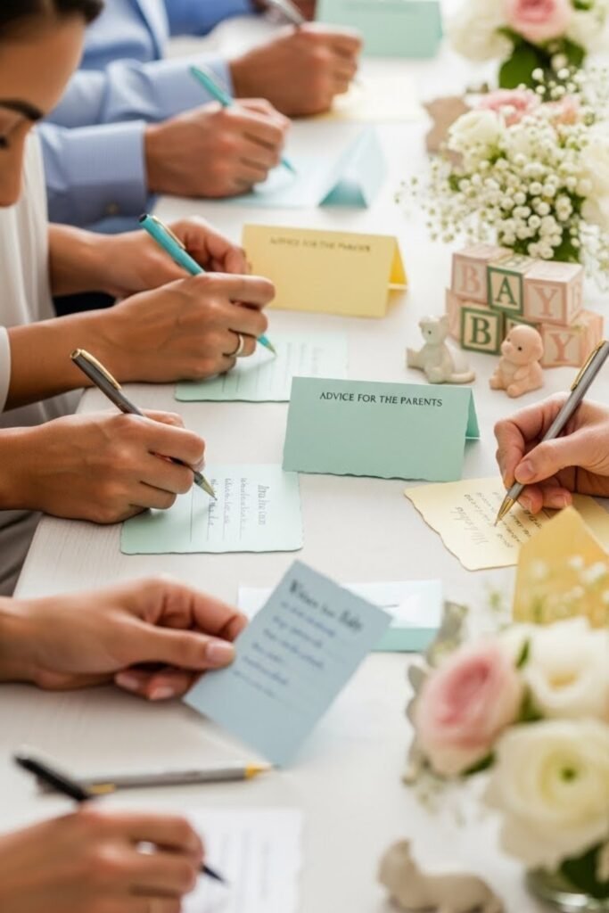 This activity adds emotional value and creates a meaningful keepsake the parents can read later. It works well for quieter moments during the shower.
