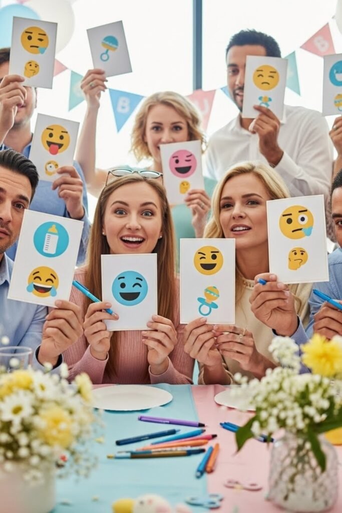 Create cards with baby-related phrases shown only through emojis. Guests guess what each emoji combination means, such as baby shower moments or parenting tasks. This game feels modern, quick to play, and works well for mixed-age groups. The guest with the most correct answers wins.