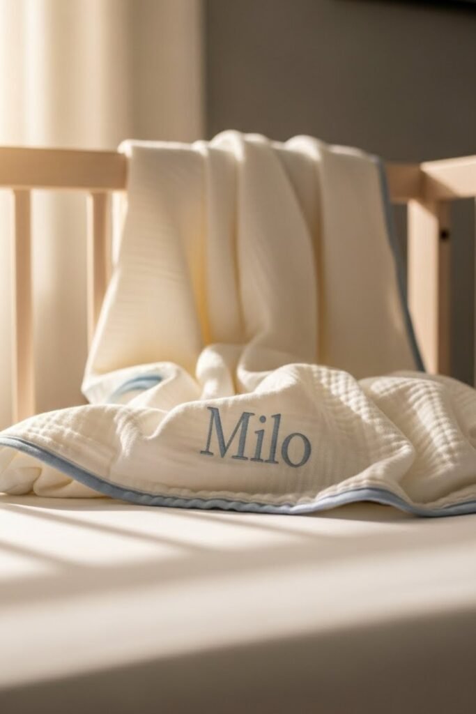 A personalized name blanket adds a special touch to a practical gift. It can be used for swaddling, stroller rides, tummy time, or nursery décor.