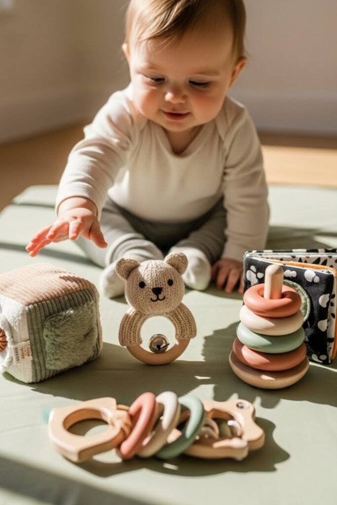 Soft sensory toys help stimulate a baby’s senses through textures, colors, and gentle sounds. These toys support early development and keep babies engaged during playtime.