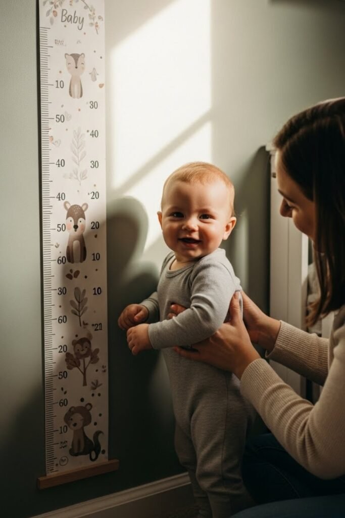 A baby growth chart tracks height milestones from infancy onward. Parents can hang it in the nursery or hallway to measure growth over the years.