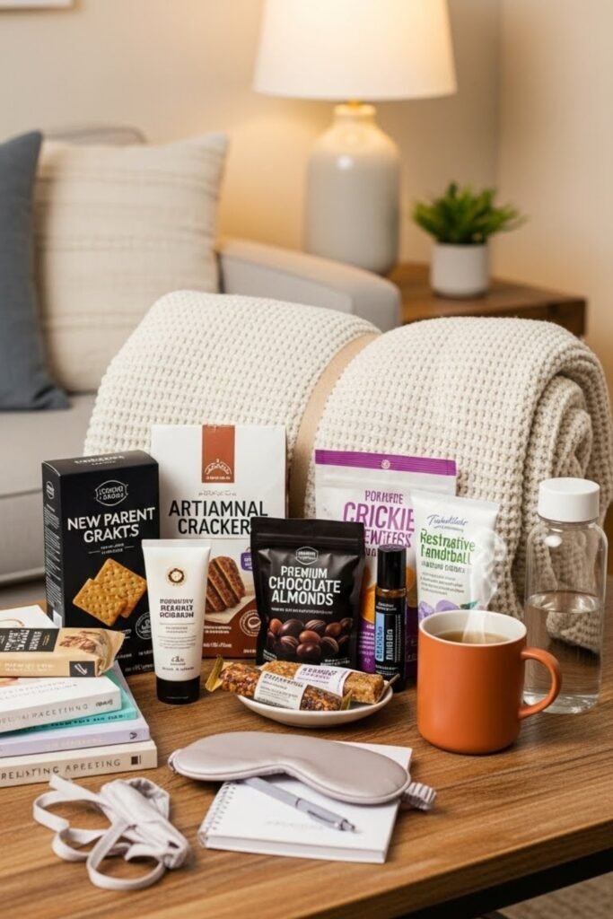 A new parent kit focuses on supporting mom and dad during the early days. It can include snacks, self-care items, and simple comfort essentials.