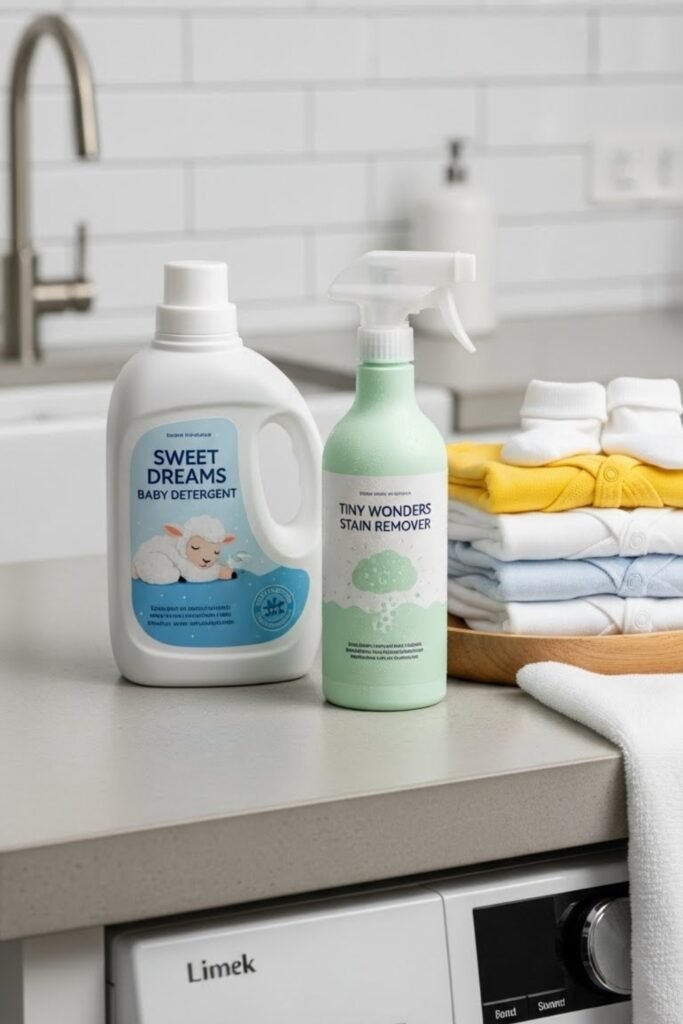 A baby laundry care set includes gentle detergent, stain remover, and washing accessories designed for baby clothes.
