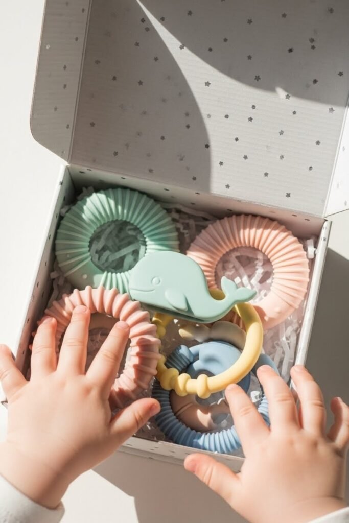 A teething gift box includes safe teethers, soothing gels, or chew-friendly toys to help babies through early discomfort.